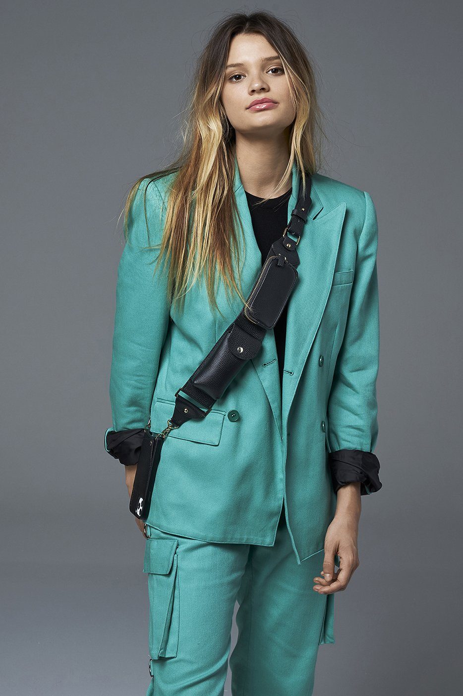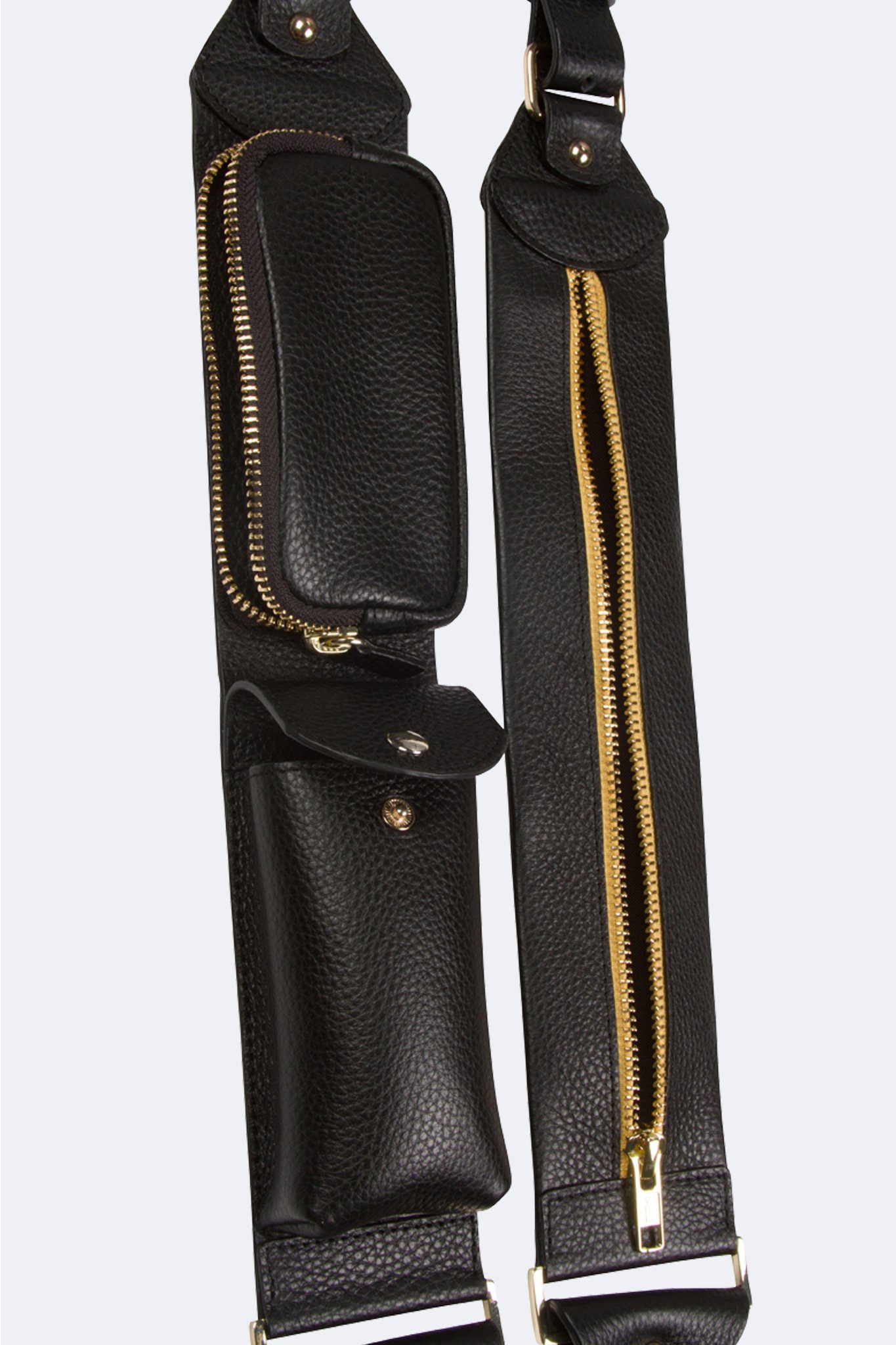 The Limited Edition Billie Strap is a multi-pocketed, adjustable, utility strap accessory for you Bandolier. This black pebbled leather design features 3 distinct compartments and a riveted purse nail adjuster for optimal length adjustment. With gold vacuum plated hardware throughout the entire design and yellow and black contrast zipper, this bold show-stopper will hold everything from your charger to lipgloss to keys to eyeliners, you name it.