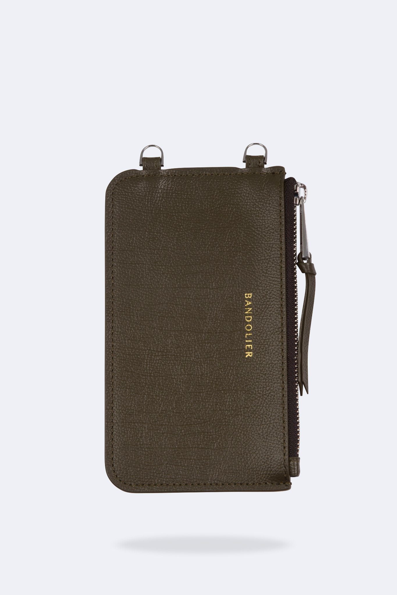 The Bandolier Flat Pouch is an absolute must-have! It's perfect for your keys, passport, lipstick, tickets, sunglasses and so much more. Featuring a dark olive leather body and silver-tone details, the Classic Pouch is an add-on to any Bandolier crossbody case. Its d-ring design allows for easy on and off access to your Bandolier strap and features a high quality pull zipper opening.