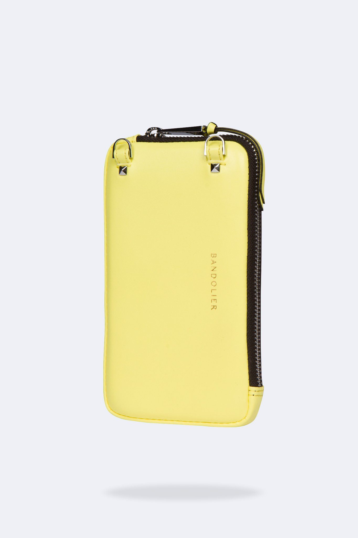 Featuring a bright yellow vegan leather body and silver-tone details, the Expanded Pouch is an even larger version of our ever-popular flat pouch and is a must have add-on to any Bandolier crossbody case. Its d-ring design allows for easy on and off access to your Bandolier strap and features a high quality pull zipper opening. This pouch provides ample room for all of your extra essentials like a sunglasses, charger and more.